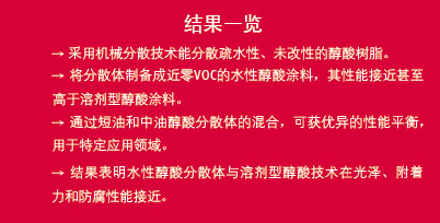 與水性涂料相比,溶劑型涂料性能方面更具優勢。一種新型技術試圖扭轉這種局面。該研究采用短油和中油醇酸水性涂料配方,試驗結果顯示光澤、附著力和防腐性能可與溶劑型涂料媲美。