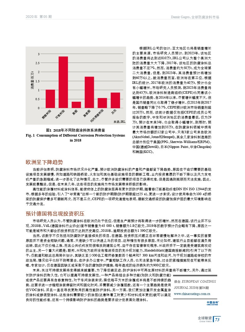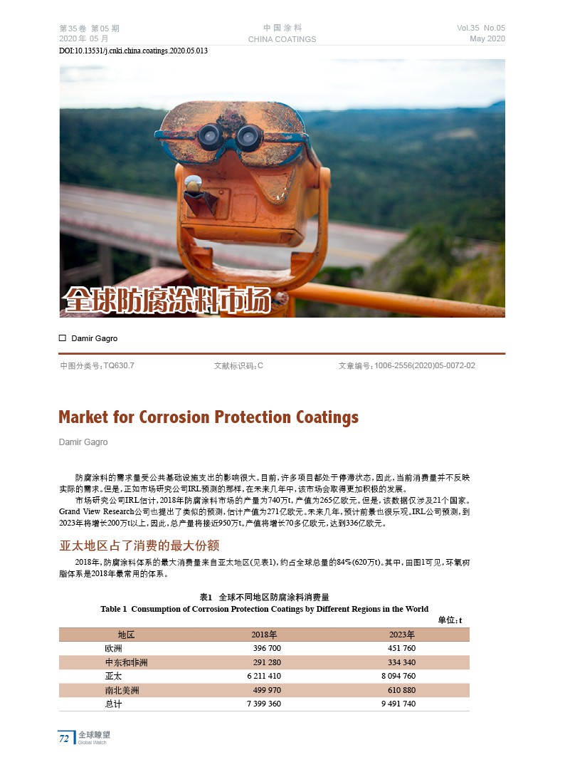 編者按:防腐涂料的需求量受公共基礎設施支出的影響很大。目前,許多項目都處于停滯狀態,因此,當前消費量并不反映實際的需求。但是,正如市場研究公司IRL預測的那樣,在未來幾年中,該市場會取得更加積極的發展。