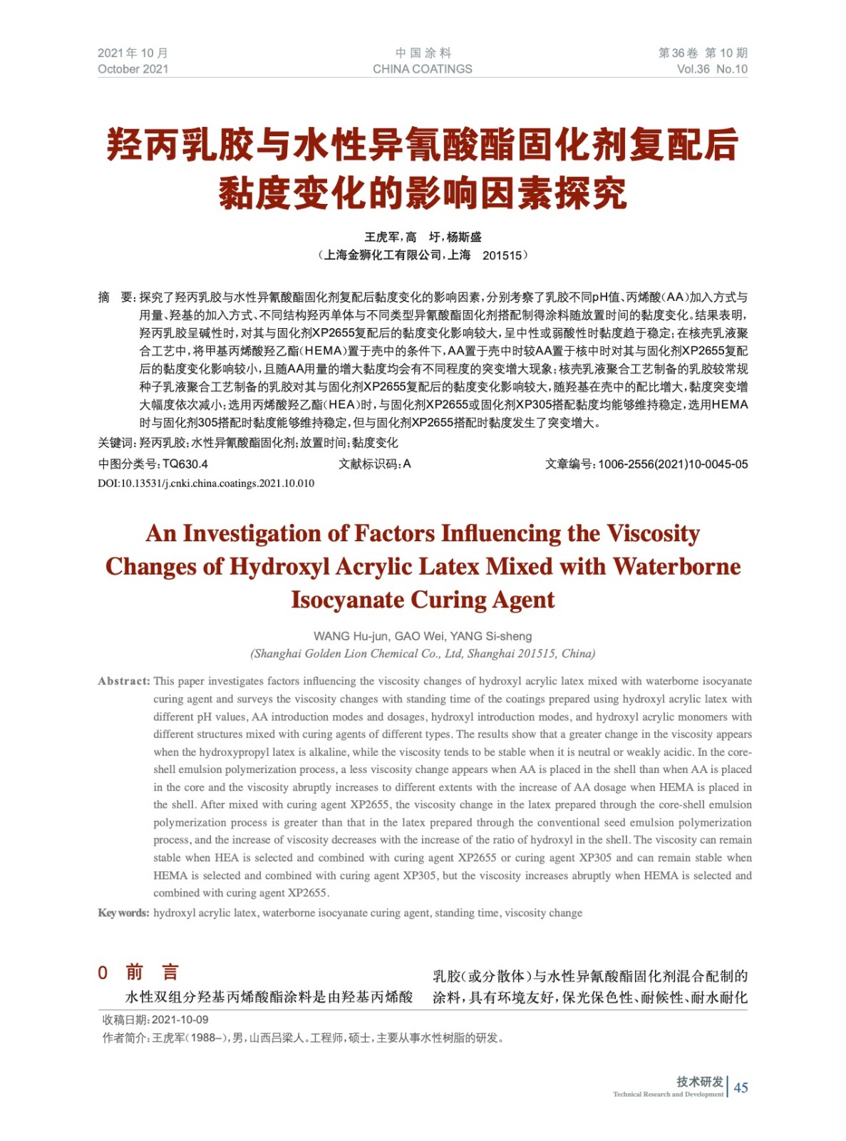 羥丙乳膠與水性異氰酸酯固化劑復配后黏度變化的影響因素探究