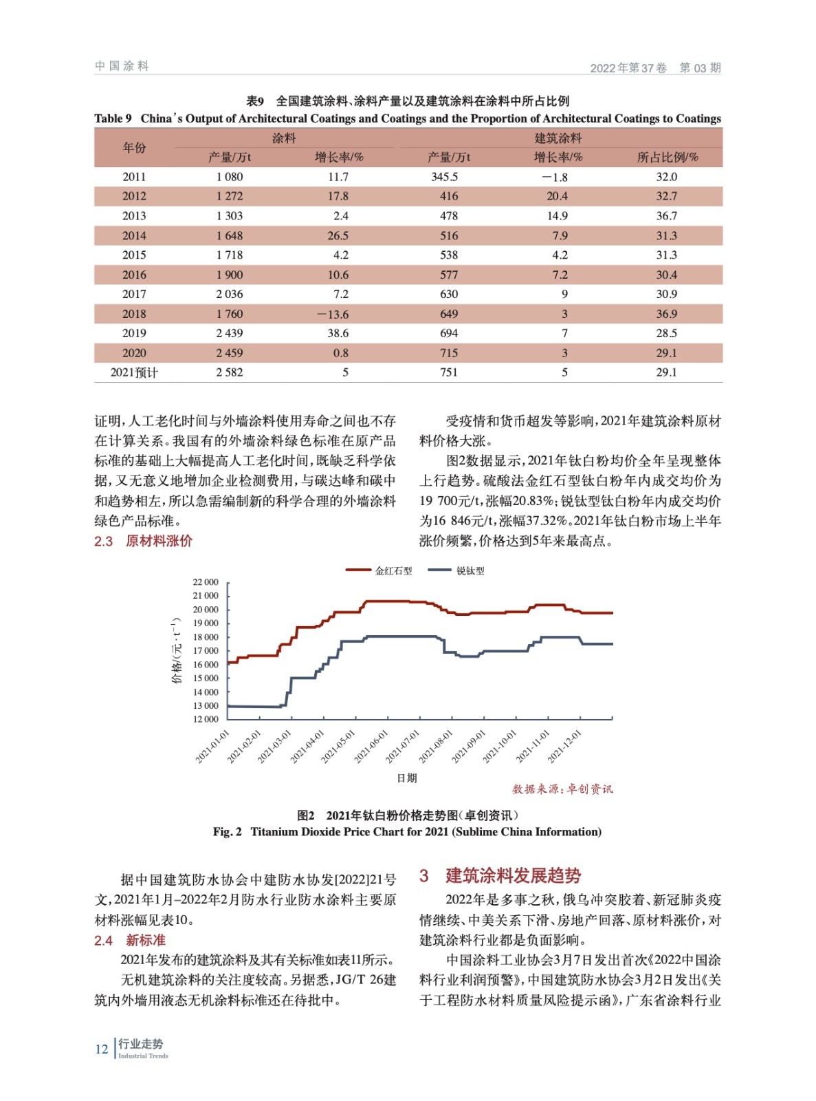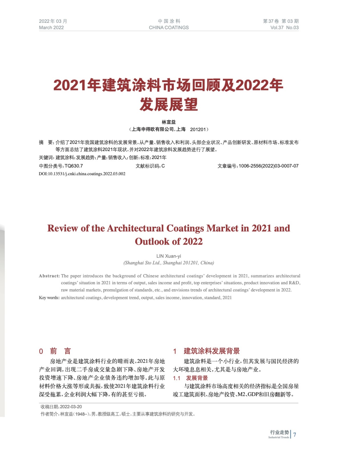 介紹了2021年我國建筑涂料的發展背景,從產量、銷售收入和利潤、頭部企業狀況、產品創新研發、原材料市場、標準發布等方面總結了建筑涂料2021年現狀,并對2022年建筑涂料發展趨勢進行了展望。