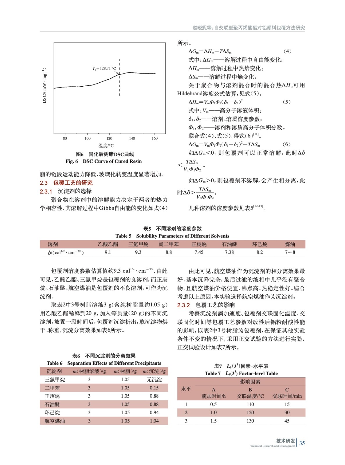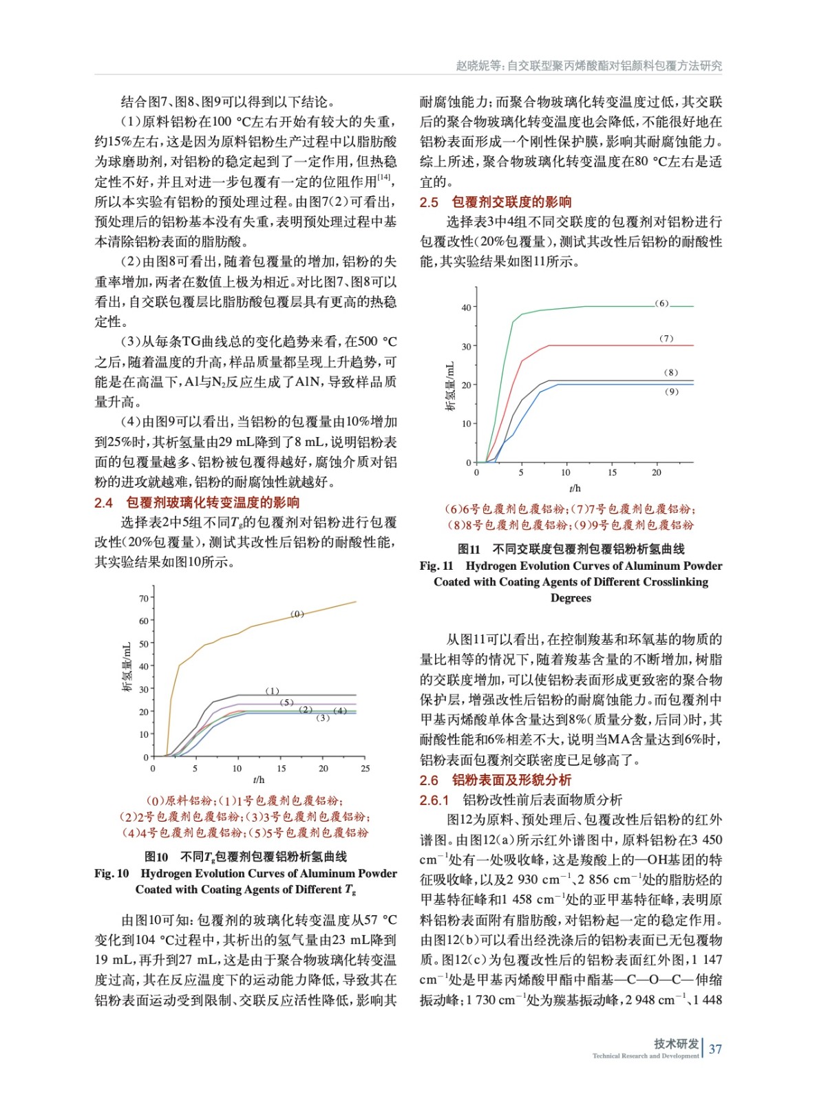 摘要:基于自由基溶液聚合方法合成自交聯(lián)型聚丙烯酸樹(shù)脂,基于高分子溶液的相分離原理對(duì)鋁粉進(jìn)行包覆改性,系統(tǒng)研究了包覆工藝、包覆量、包覆劑玻璃化轉(zhuǎn)變溫度和交聯(lián)度對(duì)改性后鋁粉耐酸性能的影響。利用熱失重(TG)對(duì)復(fù)合粒子表面包覆量進(jìn)行表征,利用差示掃描量熱(DSC)對(duì)樣品的玻璃化轉(zhuǎn)變溫度進(jìn)行表征,利用傅里葉變換紅外(FT-IR)光譜對(duì)復(fù)合粒子的表面官能團(tuán)進(jìn)行表征,利用掃描電鏡(SEM)對(duì)復(fù)合粒子表面形貌進(jìn)行表征。實(shí)驗(yàn)研究表明:改性后的鋁粉表面附有一層致密的聚合物膜,與有機(jī)小分子包覆的原料鋁粉相比,其在酸液中的緩蝕率達(dá)到85%以上。