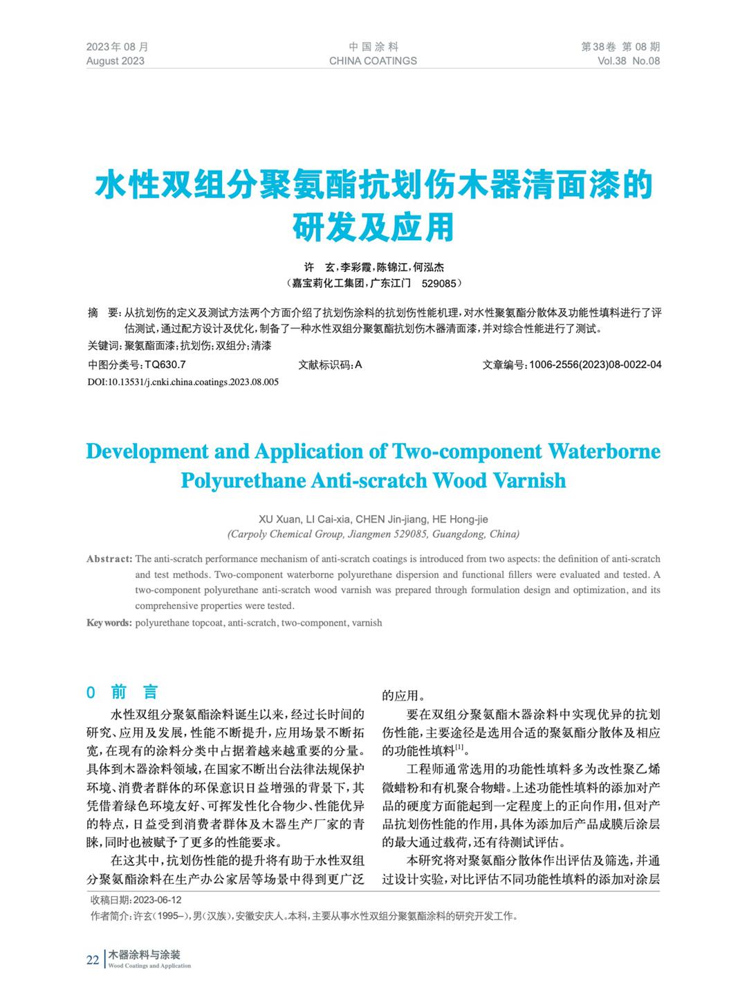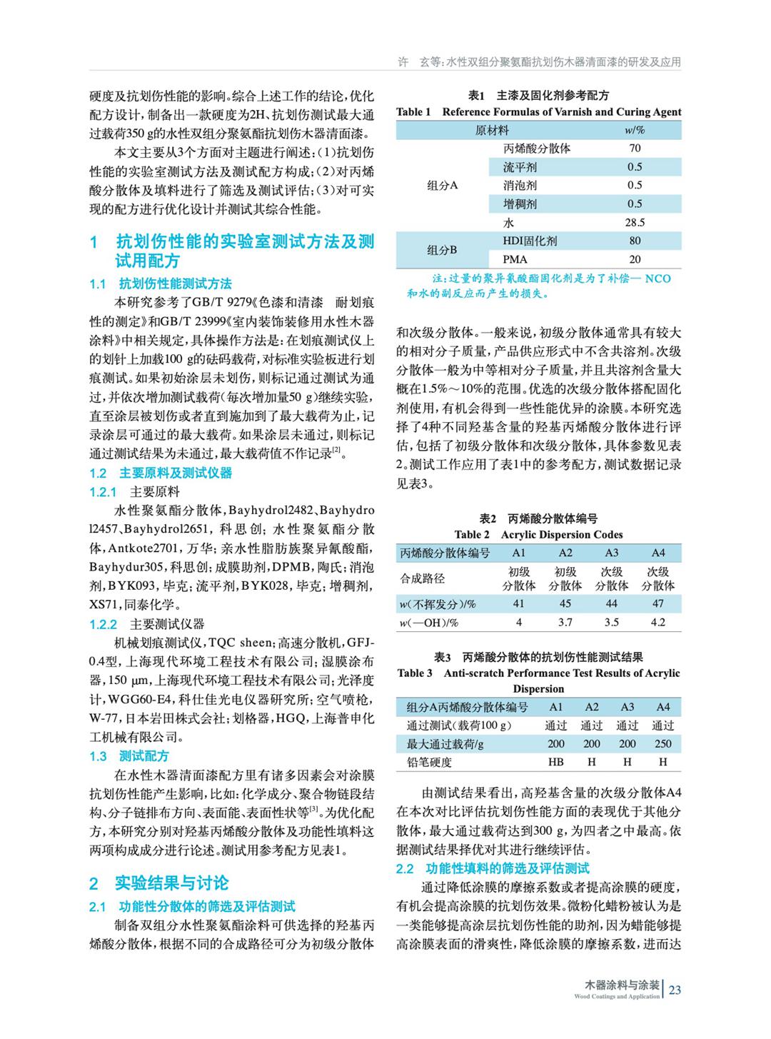 水性雙組分聚氨酯抗劃傷木器清面漆的研發及應用