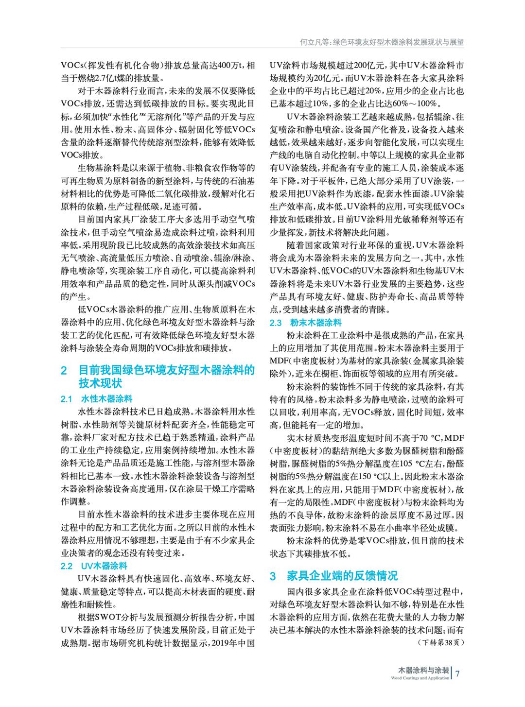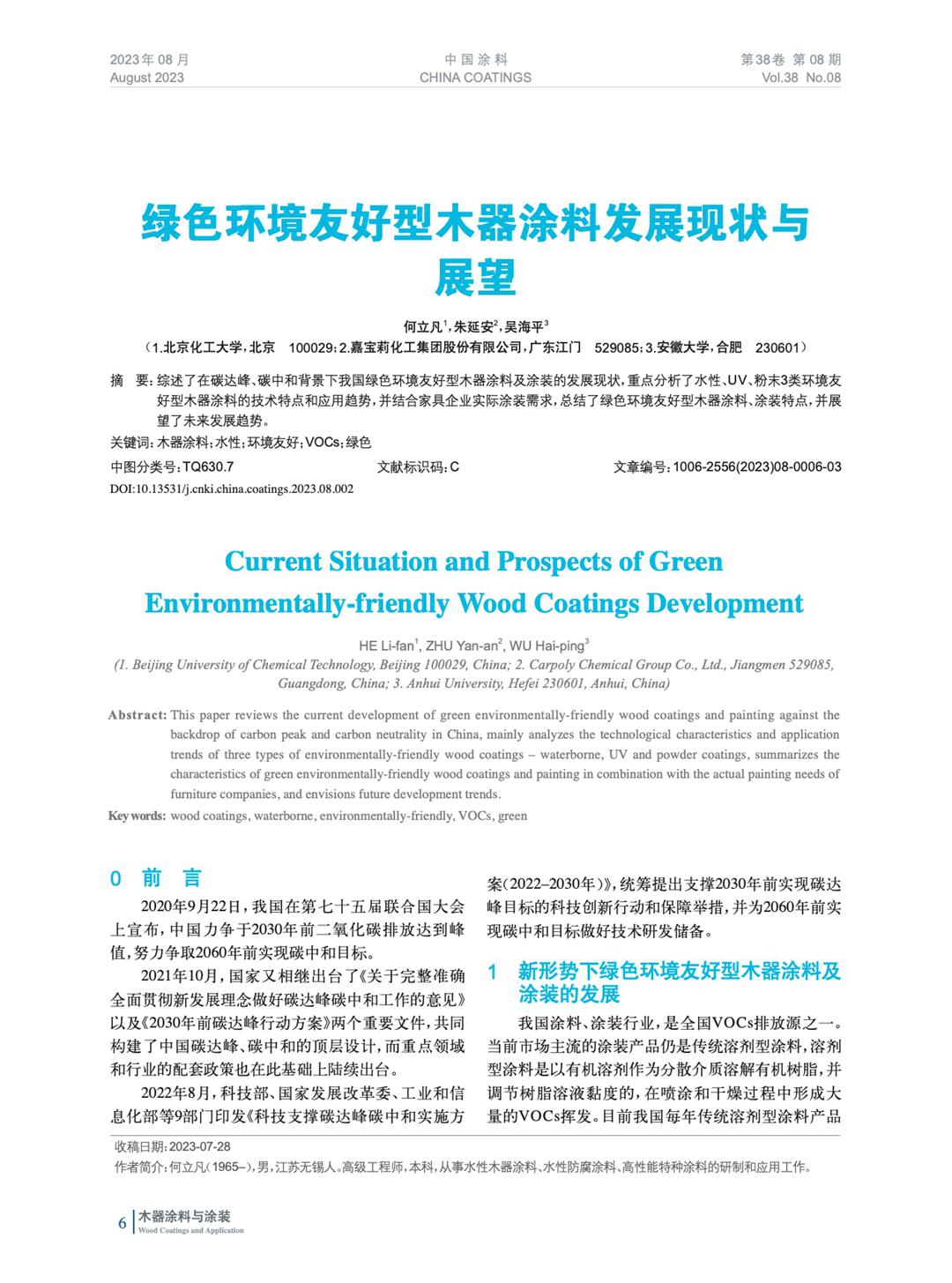 綜述了在碳達峰、碳中和背景下我國綠色環境友好型木器涂料及涂裝的發展現狀,重點分析了水性、UV、粉末3類環境友好型木器涂料的技術特點和應用趨勢,并結合家具企業實際涂裝需求,總結了綠色環境友好型木器涂料、涂裝特點,并展望了未來發展趨勢。