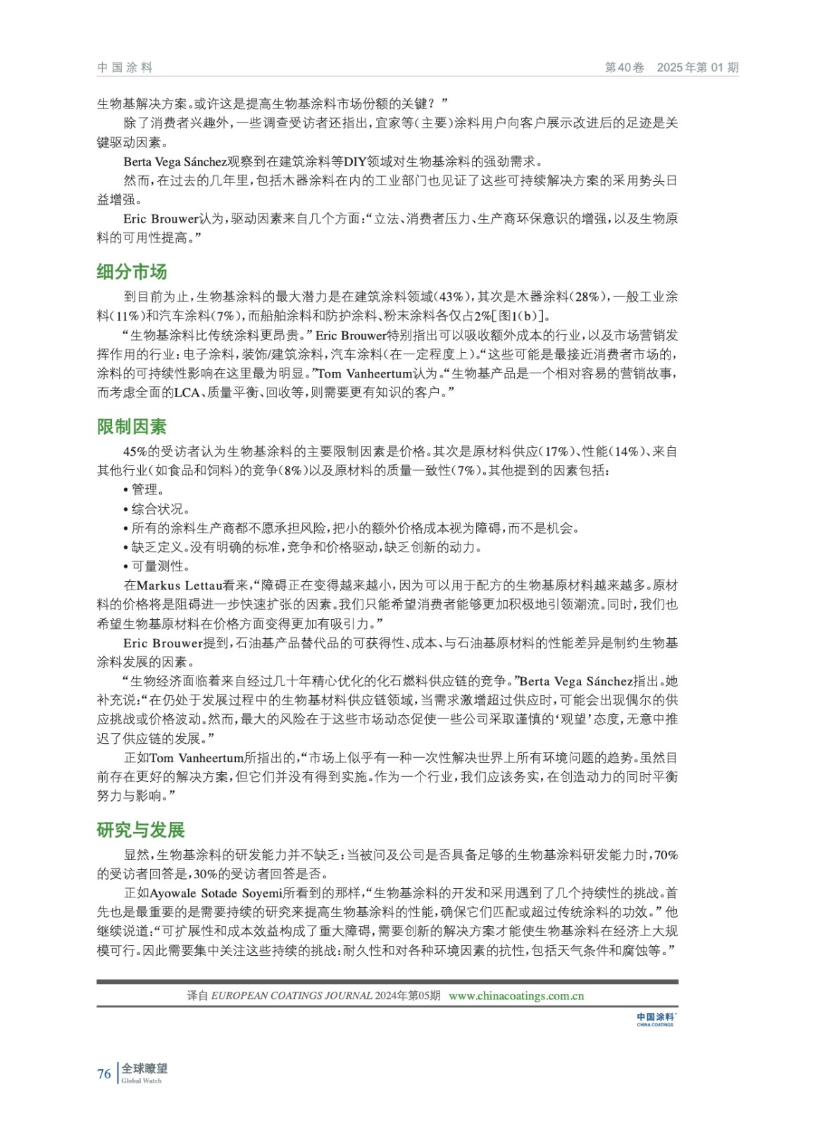 編者按:可持續性和生物基涂料是業內每個人都在談論的話題。消費者對可持續產品的要求越來越高,監管也越來越嚴格。然而,生物基體系的市場份額仍然相對較小。為了更好地了解現狀,《歐洲涂料雜志》詢問了專家,他們如何看待生物基涂料的市場,他們認為增長潛力和限制因素在哪里。