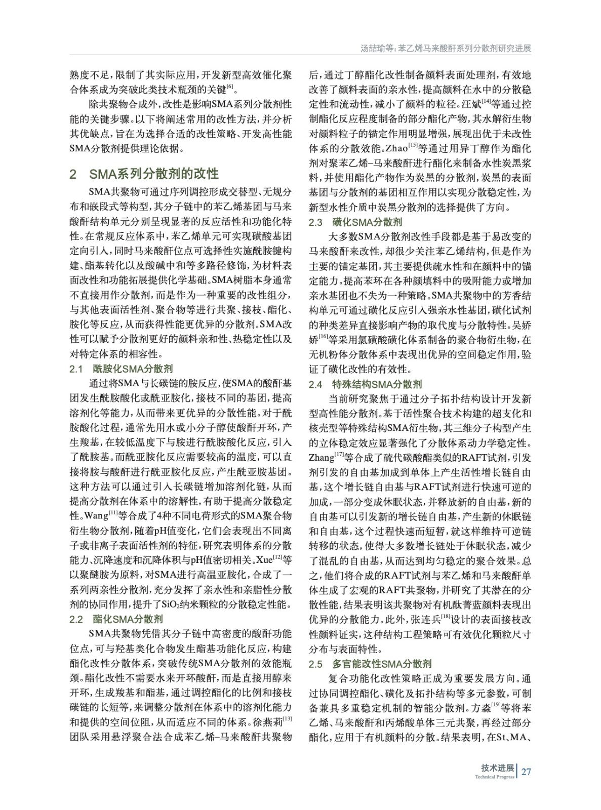 介紹了苯乙烯馬來酸酐(SMA)共聚物的常用合成方法以及配制分散劑時的不同改性策略,對比了各種方法的優缺點,旨在為優異分散劑的生產提供理論參考。另外還分析了SMA系列分散劑的應用領域與市場背景,并對未來的發展提出了展望。
