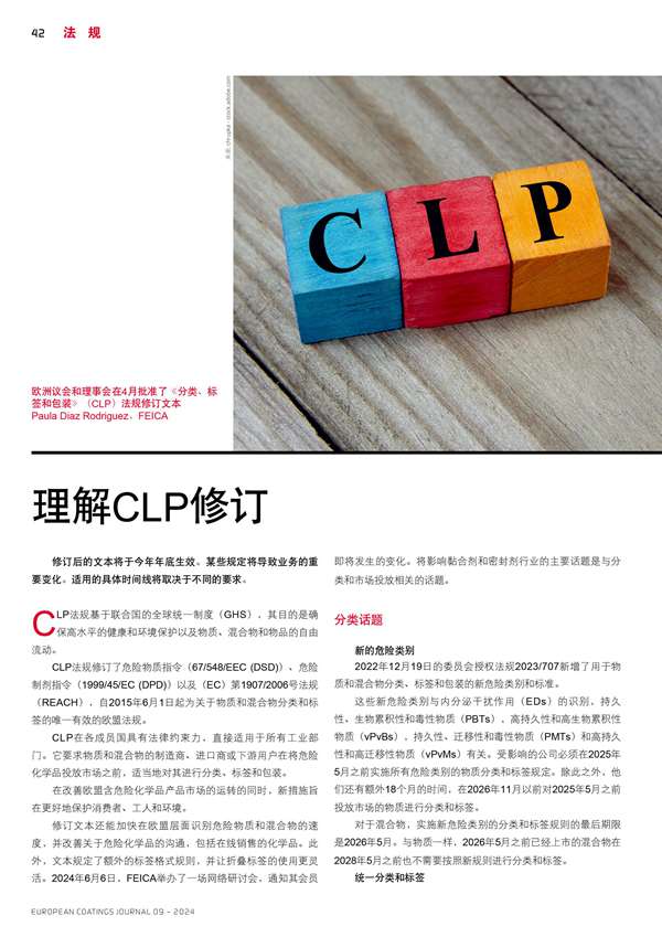 歐洲議會和理事會在4月批準了《分類、標簽和包裝》(CLP)法規修訂文本