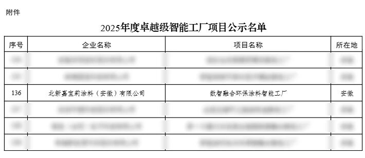 近日,工信部正式公示了2025年度卓越級智能工廠項目名單。經(jīng)過多輪嚴(yán)格評審,北新嘉寶莉涂料(安徽)有限公司打造的“數(shù)智融合環(huán)保涂料智能工廠”成功入選,榮獲國家級智能制造領(lǐng)域的重要認(rèn)可,國家級名片再+1!