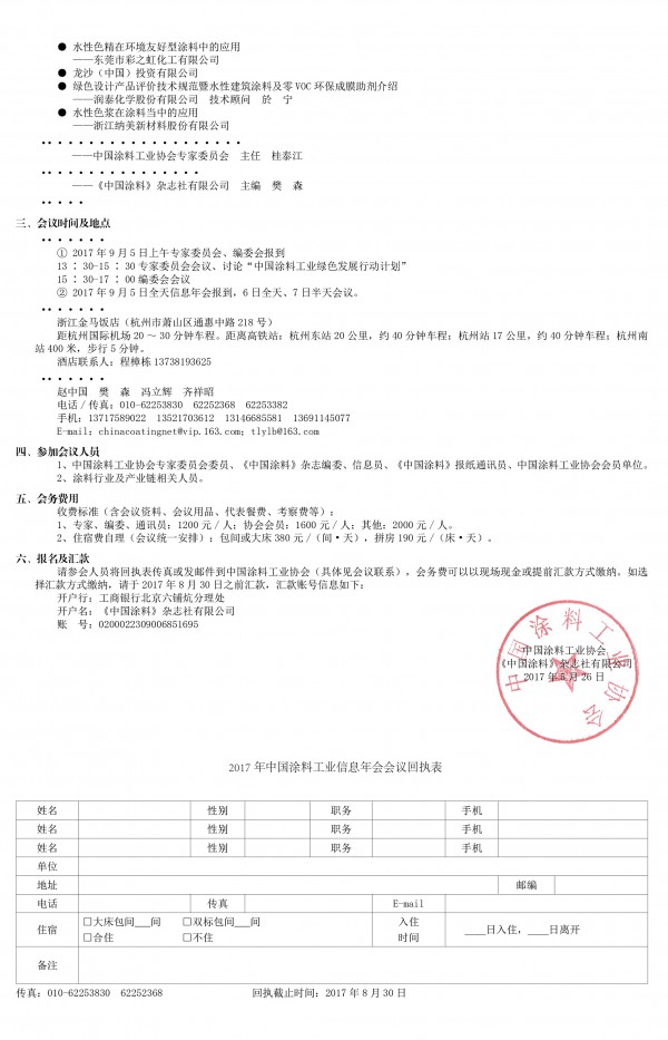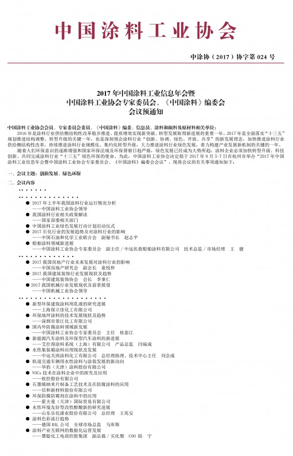 2017年中國涂料工業信息年會暨中國涂料工業協會專家委員會、《中國涂料》編委會會議預通知