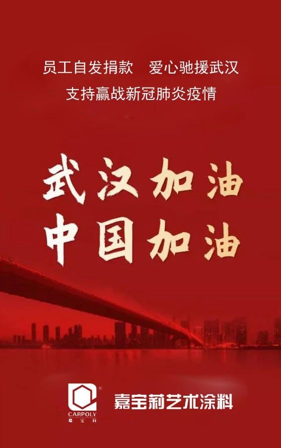 新型冠狀病毒肺炎疫情牽動(dòng)著全國人民的心。隨著疫情的不斷蔓延,為助力武漢人民共渡難關(guān),助力全國人民打贏這場來勢洶洶的疫情戰(zhàn),嘉寶莉藝術(shù)涂料員工也積極行動(dòng)了起來。由于疫情原因,公司尚未開工,大家便在微信群中自發(fā)組織捐款。