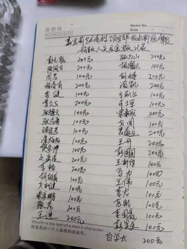 1月31日下午,在項(xiàng)目部負(fù)責(zé)人彭元聰?shù)某h下,大家踴躍捐款,你兩百,我一百,短短半天時(shí)間,項(xiàng)目部90多位員工就籌款1.14萬元,表現(xiàn)出了一方有難、八方支援的大愛精神。