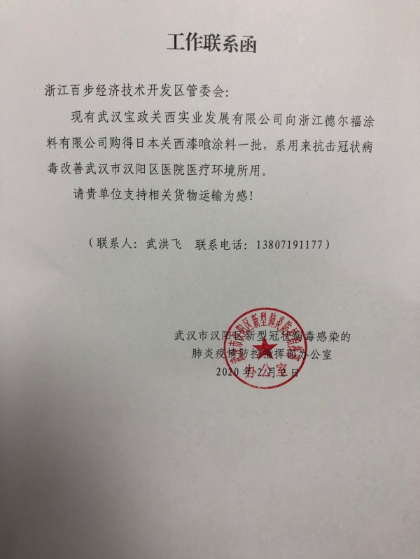 2月2日浙江德爾福涂料收到其湖北參股公司武漢寶政關(guān)西實業(yè)發(fā)展有限公司的緊急請求,急需采購進口日本關(guān)西品牌抗冠狀病毒涂料一批,用于改善漢陽區(qū)醫(yī)療環(huán)境。