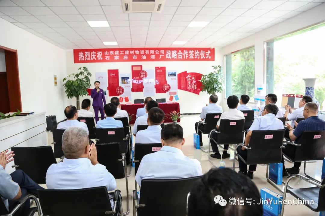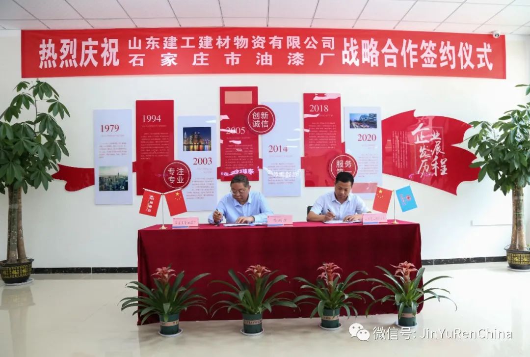 石家莊市油漆廠董事長焦亞平、山東建工建材物資有限公司董事長任俊生,代表雙方簽約。標志著雙方合作正式邁出了關鍵一步。