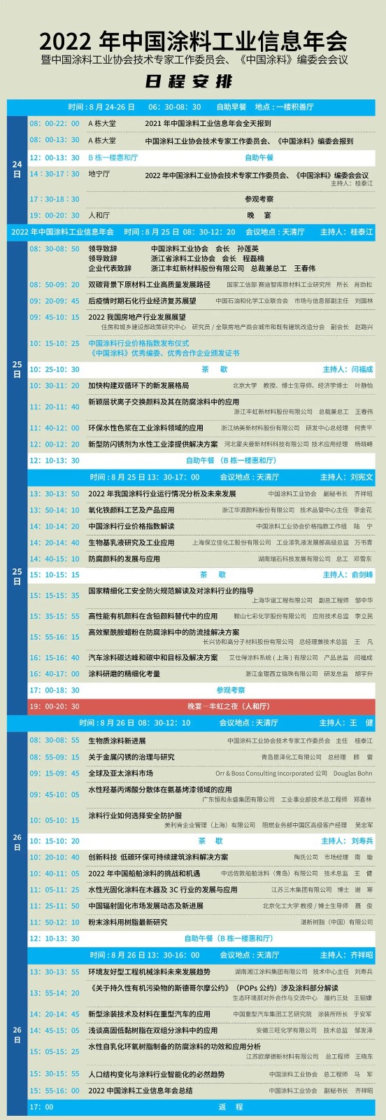 8月24–26日,“2022年中國涂料工業信息年會暨中國涂料工業協會技術專家工作委員會、《中國涂料》編委會會議”將在浙江安吉盛大開幕,來自政府部門、涂料企業、原材料企業、設備企業、互聯網公司及行業專家的約500余位代表將出席會議。