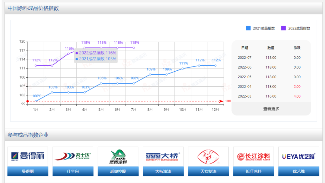 成品價(jià)格指數(shù),通過對(duì)重點(diǎn)品牌涂料產(chǎn)品的流通價(jià)格進(jìn)行收集,經(jīng)過有效篩選和科學(xué)算法統(tǒng)計(jì),與基準(zhǔn)數(shù)據(jù)進(jìn)行對(duì)比后形成。統(tǒng)計(jì)品類包括了建筑涂料、防水涂料、工業(yè)涂料、防腐涂料、地坪涂料、船舶涂料、木器涂料、汽車涂料、粉末涂料、集裝箱涂料、卷鋼涂料及包裝涂料在內(nèi)的主要涂料產(chǎn)品。