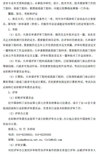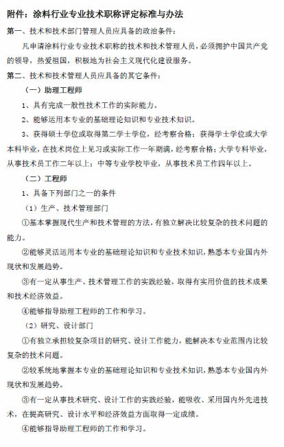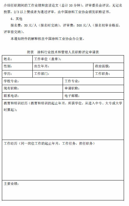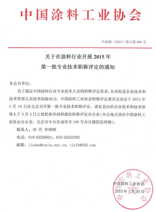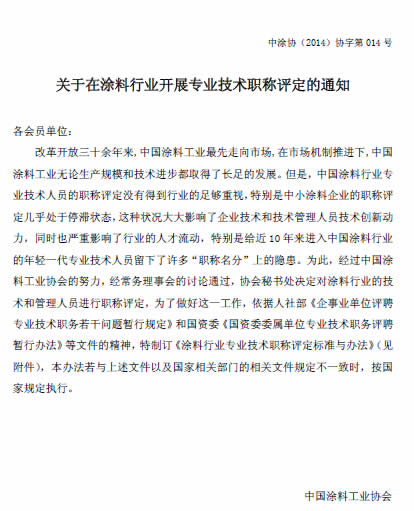 為了滿足中國涂料行業(yè)專業(yè)技術(shù)人員的職稱評(píng)定要求,從而促進(jìn)企業(yè)技術(shù)和技術(shù)管理人員技術(shù)創(chuàng)新動(dòng)力,中國涂料工業(yè)協(xié)會(huì)職稱評(píng)定委員會(huì)決定于2015年3月10日在北京召開第一批專業(yè)技術(shù)職稱評(píng)定,請(qǐng)有意向的企業(yè)技術(shù)和技術(shù)管理人于3月5日之前把相關(guān)材料報(bào)給職稱評(píng)定辦公室(辦公地點(diǎn)設(shè)在中國涂料工業(yè)協(xié)會(huì)辦公室:北京市豐臺(tái)區(qū)成壽寺158號(hào)辦公樓四層西側(cè))。詳見下文附件一、附件二或《涂料行業(yè)工程技術(shù)人員和管理人員職稱評(píng)定標(biāo)準(zhǔn)與辦法》[中涂協(xié)(2014)協(xié)字第014號(hào)文](http://www.chinacoatingnet.com/plus/view.php?aid=2578)。