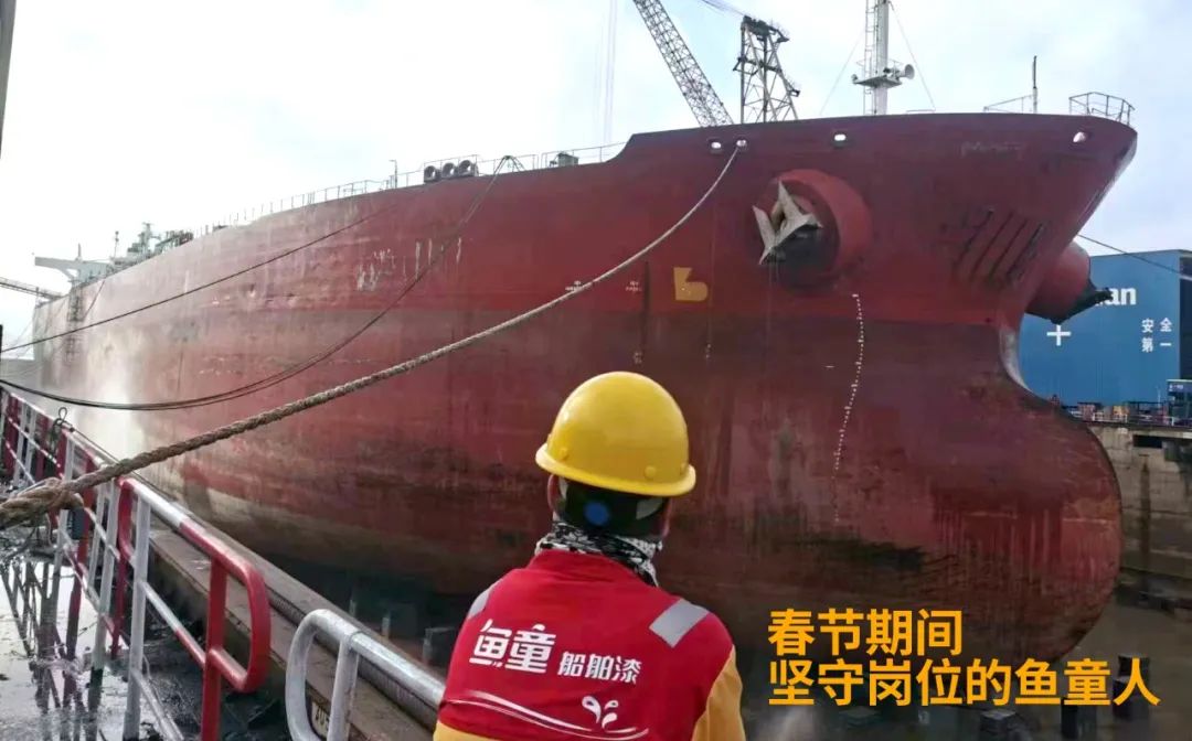 15萬DWT油船船長274米,寬48米,型深23米,是海上巨無霸。這個項目工期恰逢春節假期,魚童面臨著巨輪涂裝面積大、工期緊、人員不足、物流難等挑戰。為配合船廠施工進度,魚童從生產到物流供應鏈保障,再到現場的技術服務工程師們,他們舍棄了春節與家人團聚的時光,堅守崗位,用行動詮釋了責任與專業,在寒凍的天氣里為客戶提供溫暖貼心的服務,得到了船東和船廠的一致好評!在此,向每一個春節堅守崗位的人致敬,也向每一個奮斗路上的你致敬。