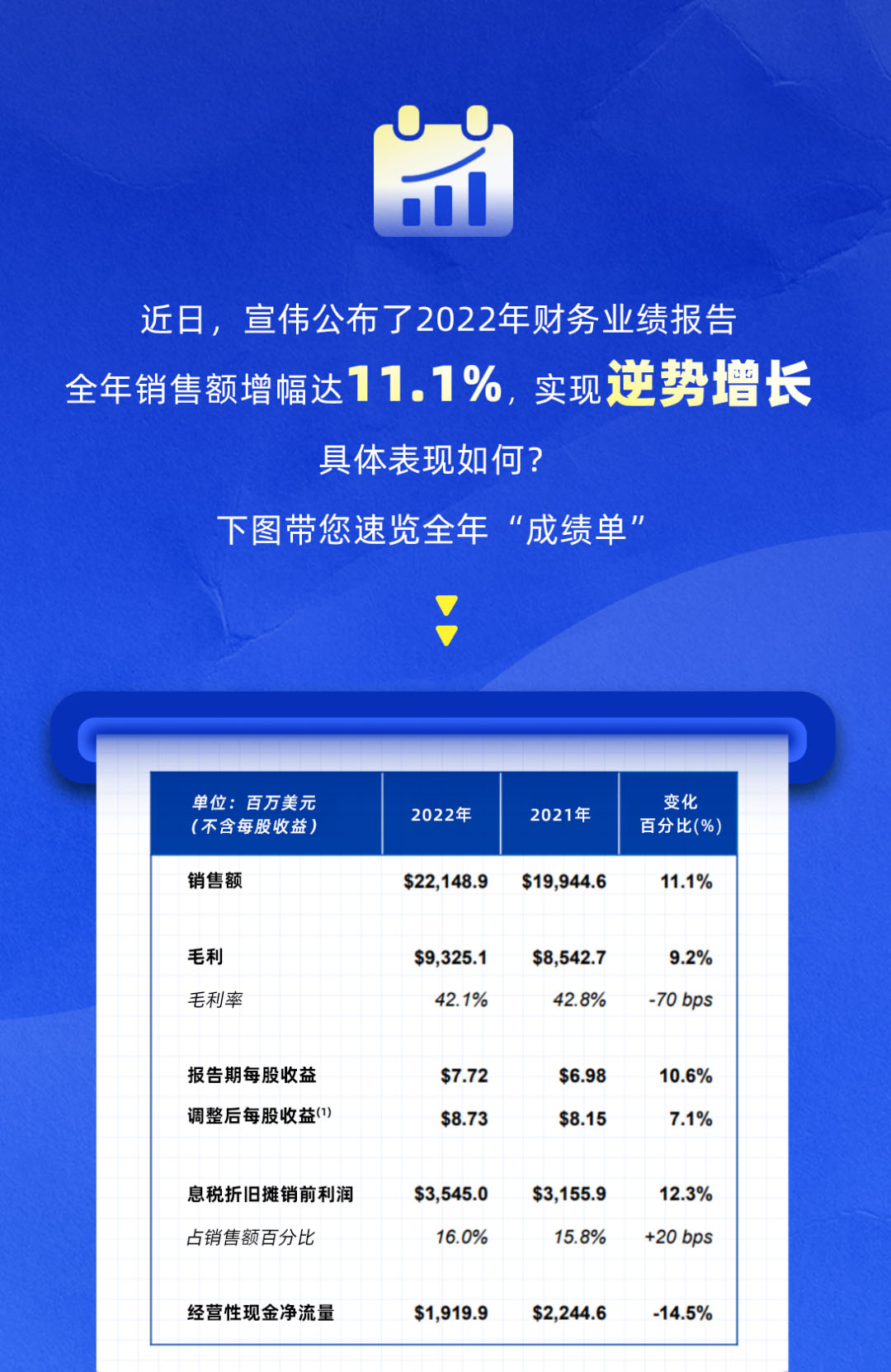 近日,宣偉公布了2022年財(cái)務(wù)業(yè)績報(bào)告全年銷售額增幅達(dá)11.1%,實(shí)現(xiàn)逆勢增長具體表現(xiàn)如何?本文帶您速覽其全年“成績單"。